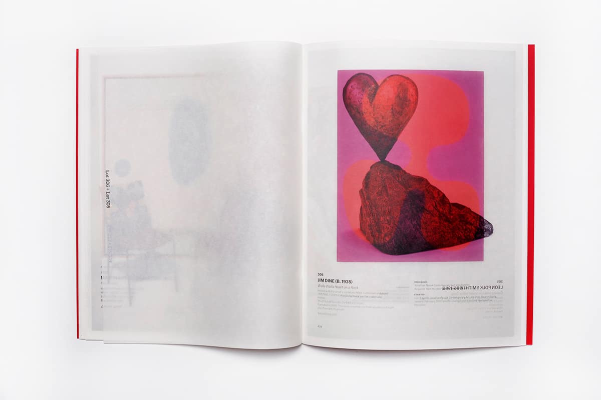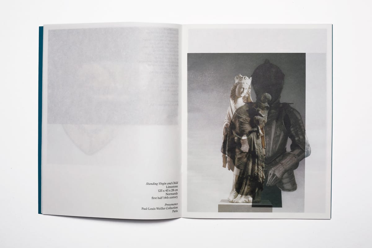 The photo series in the booklets is not intentionally interconnected but shares a consistent creation process. Pages from catalogs and magazines are torn out and placed on a lightbox, making both the front and back of a page visible simultaneously—an effect that cannot be achieved otherwise. These images are captured using a large-format analogue camera. While the images may appear digitally enhanced, the technique intentionally relies on chance rather than digital manipulation to bring images together. The process involved reviewing thousands of pages, with personal taste playing a key role in selecting the final combinations. The emphasis is on the pleasure of discovering fitting image pairings rather than constructing them. This approach serves as a response to the overwhelming prevalence of manipulated and digitally altered imagery in daily visual culture. The red booklet features pages from Christie’s auction house catalogs, the blue booklet highlights pages from TEFAF art fair catalogs, and the yellow booklet showcases images sourced from photography and Life magazines.